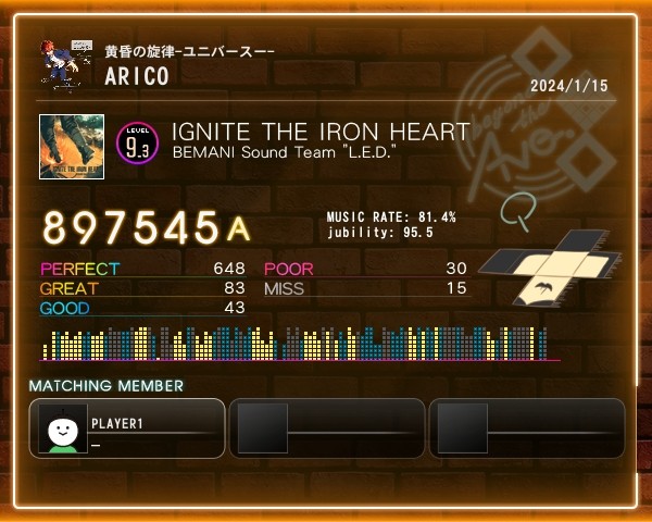 IGNITE THE IRON HEART(EXT)初プレー、9越えるから少し身構えてたんだけど、下手だけど予想より押せてビックリ…90万点まで後少し。