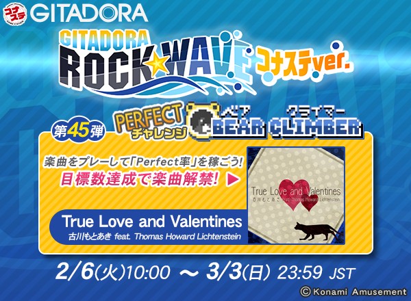 2/6(火)より #コナステ #ギタドラ にて「GITADORA ROCK WAVE コナステver.第45弾 PERFECTチャレンジ BEAR CLIMBER」を開催! Perfect率をためてビルを登れ! 目標達成で楽曲「True Love and Valentines」がコナステで解禁! コナステGITADORAで遊べるようになるぞ! このチャンスを見逃すな!