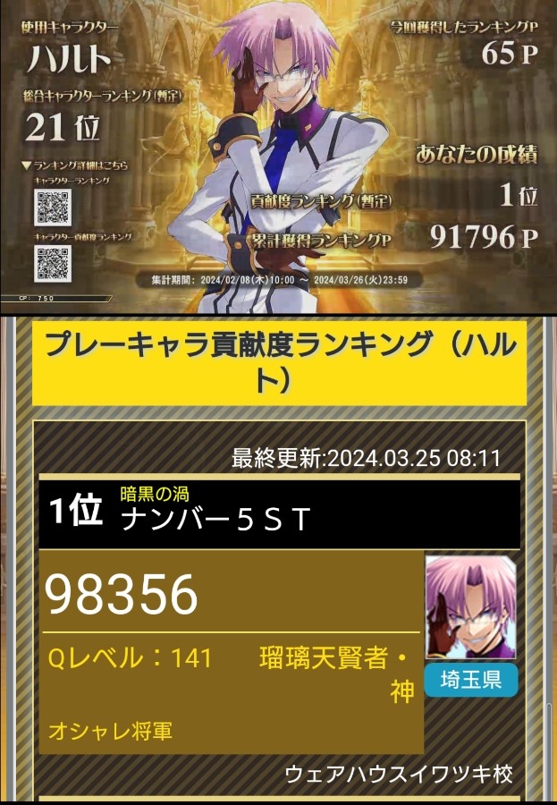 昨日(2024年3月24日㈰)は精神が崩壊する寸前までプレイしていたが、6560P貢献できたのである。 目標の100000Pには到達ならず。 今日(2024年3月25日㈪)は吾輩の4連休最終日なので、必ずや達成させる。 猟友会の活動が絡むものの、問題ないハズである😀。