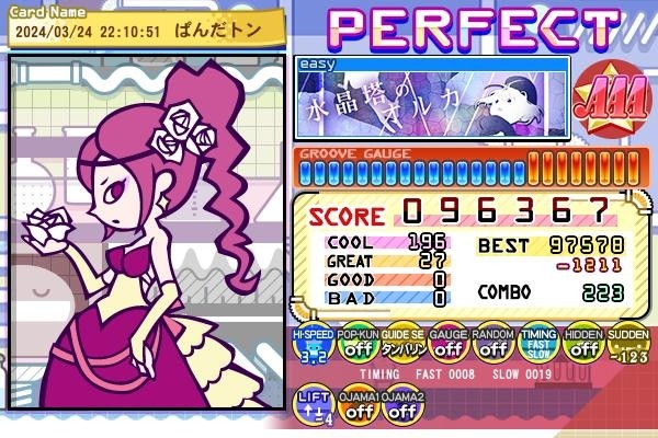 水晶塔のオルカE パフェAAA。これでイージー未パフェ14曲。