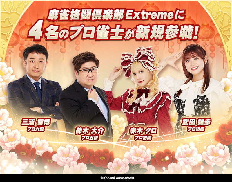 本日より、『麻雀格闘倶楽部 Extreme』に4名のプロ雀士が新規参戦! #三浦智博 プロ #鈴木大介 プロ #赤木クロ プロ #武田雛歩 プロ ■詳細はこちら http://eagate.573.jp/game/mfc/ac/news/202404/01/news.html