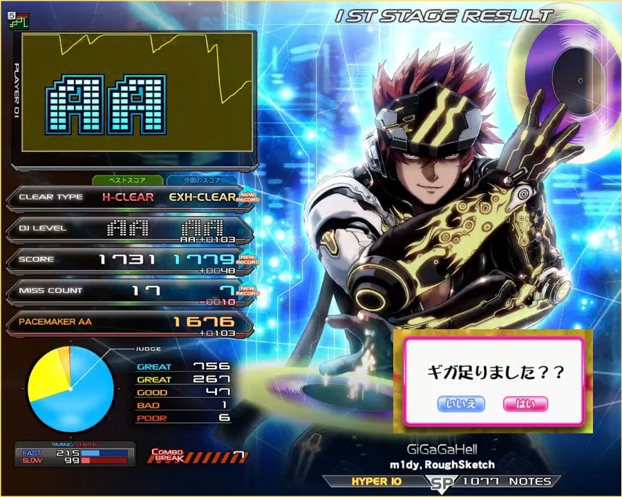 ・GiGaGaHell (SPH・Lv10):難→EXH。 SPサイド新規Lv10エクハクリア。 週末のイチオシより長期放置から進展のあった譜面。 ワンチャンのミスカが出たので続けてエクハまで持っていけました (^^) 速さについていけるかが一番重要ですがラストに事故を誘発する配置もあるので油断禁物。