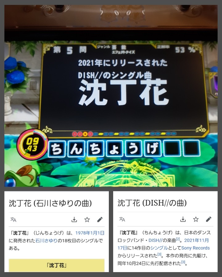 おまけ 本日の2択 「ちんちょうげ」か「じんちょうげ」で迷ってたら メガホン貰って正解(多謝) 理エフェだとどっちも正解だったような気がします ちなみに復習で 「じんちょうげ」と書いてたら不正解でした(それはそう) なお石川さゆりの曲「じんちょうげ」も 芸エフェで出題されるようです 紛らわしすぎない?…😇