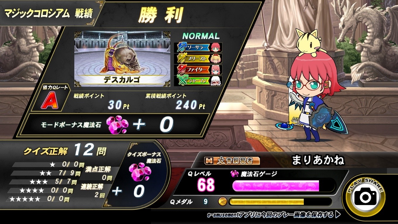 マジックコロシアム4回目。この回はソーサラーを選んでバトル。 16問目で決着。4問ミスして結果は勝利。
