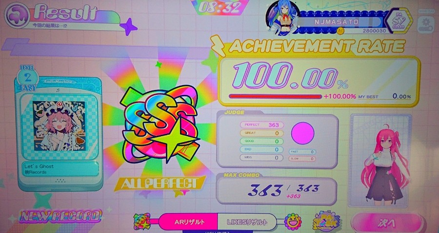 Let's Ghost(EASY)3曲連続!1発100.00%オールパーフェクト達成!僕の知らない間に『東方曲』が増えていたのでAPを取りにいきますか!次に僕が選んだ東方曲は「Let's Ghost」です!暁Recordsさんの東方曲「Let's Ghost」がポラリスコードに収録しましたね!改めてポラリスコードで「Let's Ghost」を聴きましたけど!とってもとっても愉快な曲ですね!ポラリスコードで「Let's Ghost」をプレイしたら!待たしても初プレイでいきなり1発APを取っちゃいました!Let's Ghost!3曲連続!1発100.00%オールパーフェクトを取れて最高に嬉しいです!暁Recordsさんの東方曲「Let's Ghost」3曲連続で1発AP!!!!!!
