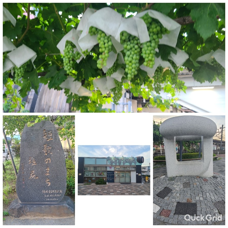 おまけ投稿・塩尻駅。 上→東口のぶどう🍇。 「安心して下さい。本物ですよ😄」