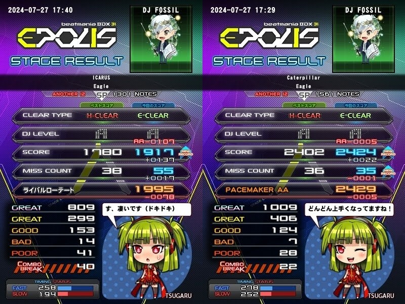 Eagle楽曲の2譜面でスコア更新。 Caterpillar(A)はAAまであとわずか。