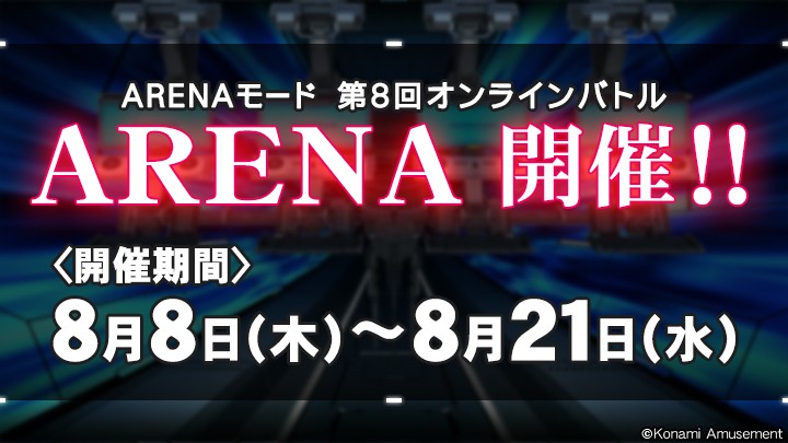 【イベントのお知らせ】 4人によるリアルタイム対戦『ARENAモード』の第8回オンラインバトルが開催決定!開催期間は8/8(木)~8/21(水)まで! https://p.eagate.573.jp/game/2dx/31/event/arena_mode/index.html #IIDX