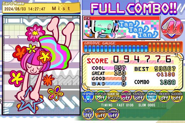 銅☆→銀◇ 階段終端で直前ポップ君と違う段の同時押しに着地しないといけない箇所は慎重すぎるくらい慎重に手を動かしたが、全体的に跳ねたリズムも含めて、精度捨ててでもミス減らそうなんて全然したつもりないのにAA止まりなのが現状の認識力限界だと突きつけられたとも思われる。