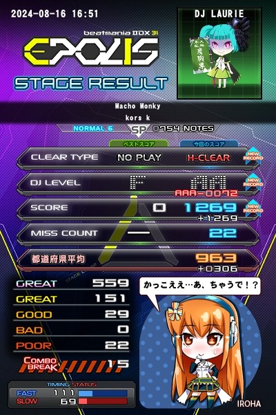 2024.8.16(金)今日のIIDX No.5 筋肉猿 [SPN] 初プレー!! [SPN]☆6でも屈指の難易度を誇る譜面。 初見一発HARD成功!! 「よく耐えた!1枚差し上げて!」