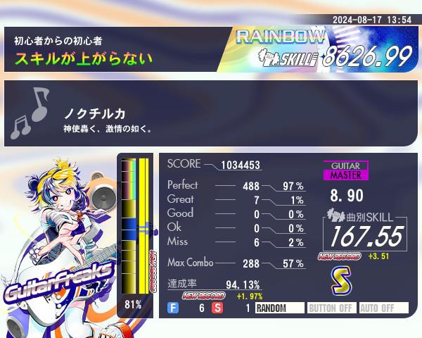 少し時間ができたので新曲をプレイ。 切ってるところは要研究します。 そこが繋がった安堵でラストのオープン絡みのところ切る未来が見える、、、 強いて言うならこのリザルトで切ってるとこと今言ったラストのオープンのとこなので短期集中でなんとかフルコンしたいところ。