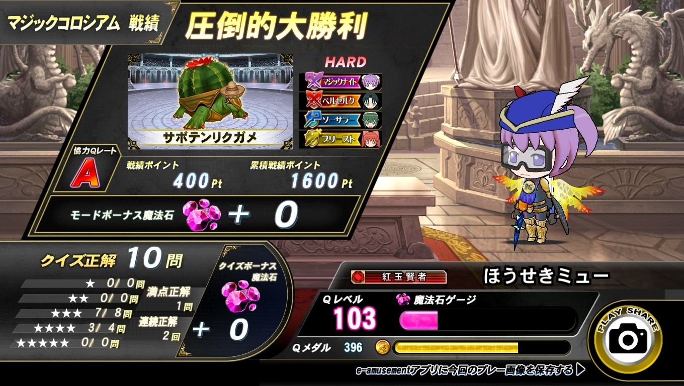 QMA マジコロHARD 1回目、3回目大勝利 2回目圧倒的大勝利 『ゆっくりシャロンですわ』スタンプもらえました(≧∇≦)b