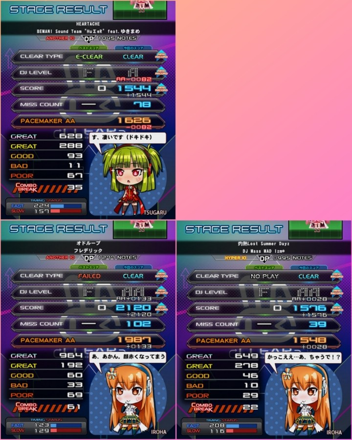 DPサイド新規クリア系収穫集。 ・HEARTACHE (DPA・Lv10):易→普 ・オドループ (DPA・Lv10):落→普 ・灼熱Lost Summer Dayz (DPH・Lv10):普 HEARTACHE、オドループは共にDPの方が難しい譜面。 新曲の灼熱はこの後ハードも狙いましたが初日は未遂案件。 これは熱意かWEEKLYターゲットで狙いますかね (^^;