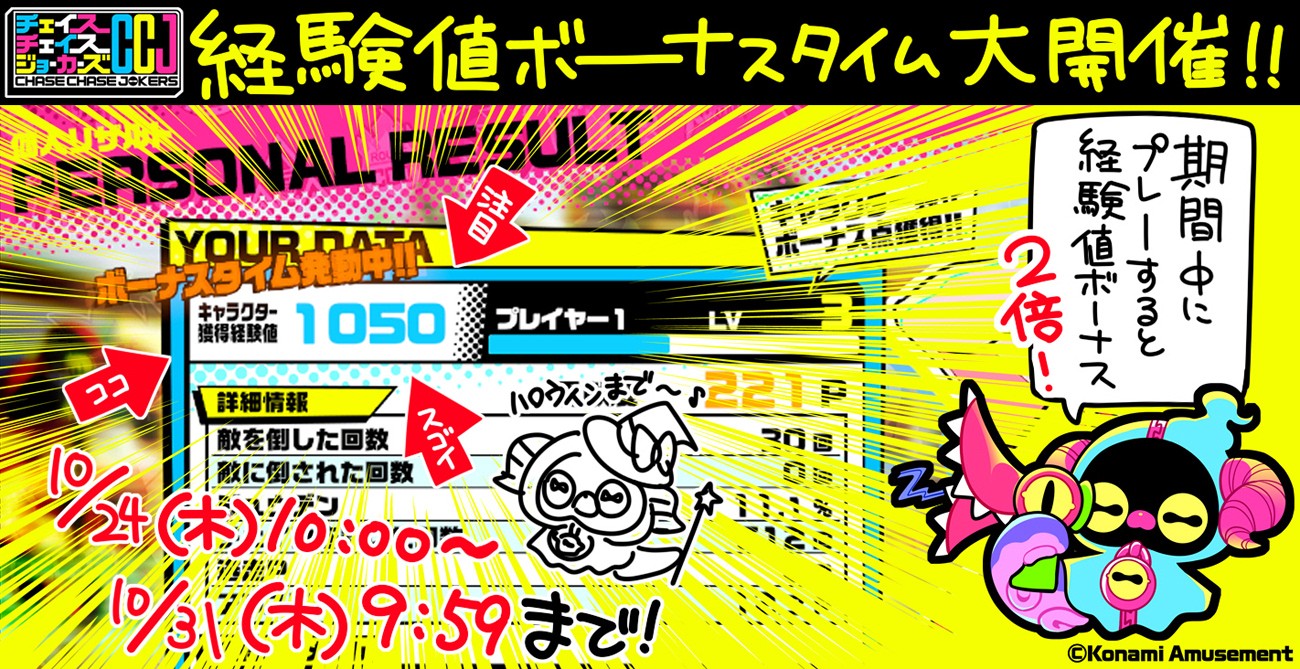 ごきげんヨ~♪ 獲得経験値が2倍になる『経験値ボーナスタイム』を開催するヨ~! 期間は10/24(木)10:00~10/31(木)9:59! ハロウィンまでつっ走れ~ #チェイスチェイスジョーカーズ