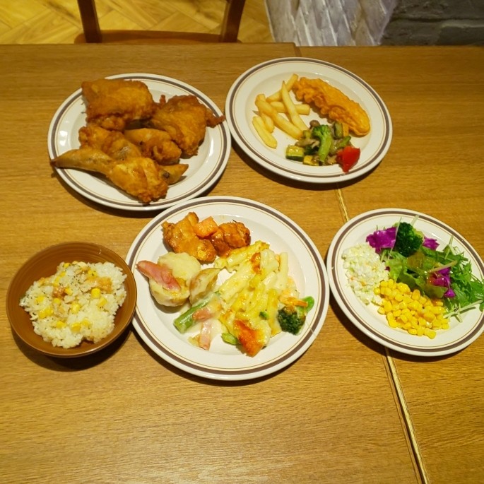久々にケンタッキー食べ放題行ってきた🍴🆓✨🍗。オリジナルチキンだけでなくクリスピーチキンやナゲット、ガーリックライスにサラダ、フライドポテト等も食べ放題です😄。
