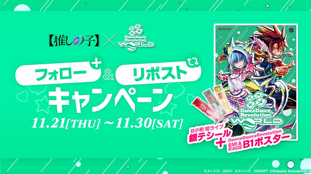 【キャンペーン開催!】 「#我ら完全無敵のアイドル!!」楽曲収録を記念して、抽選で5名様にグッズが当たるキャンペーンを開催! @DDR_573 と【推しの子】ドラマ&映画公式 @oshinoko_lapj を両方フォローし、このポストをリポストしよう! 詳細はこちら! https://oshinoko-lapj.com/news/article/?id=267 #DDR_WORLD #推しの子