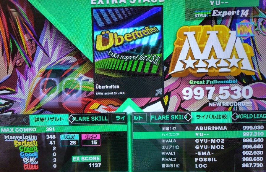 例の所、最初は良かったけど横移動した瞬間にグレがが💦 まあとりあえずこれで鬼譜面の解禁は終わりました(^_^;)