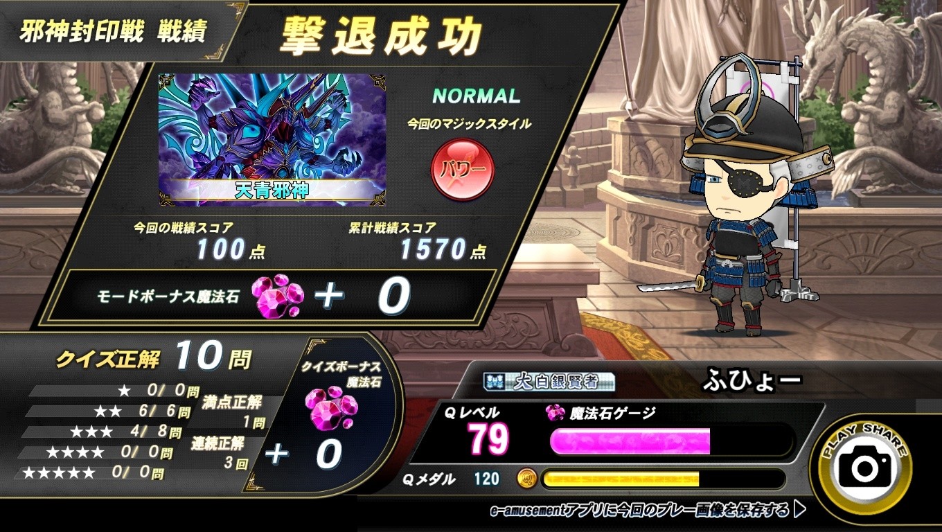 対天青邪神3戦目は、4人中自分を含めた3人がコナステからの参加。見事に勝利、直後の4戦目もギリギリ勝利し、ちび魔龍ゲットにリーチをかけました。 共闘してくれた皆さんには、毎回感謝しています。