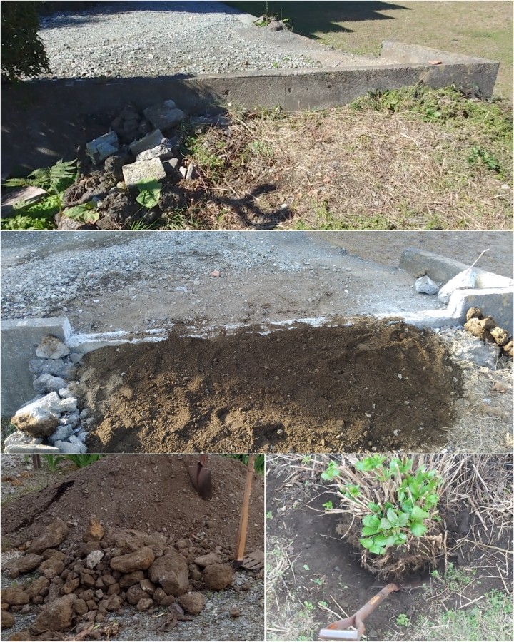 隣人の力による現状変更を受けて、週末はわたくし独りで工事の年となりました🙄 最大の敵難・鉄筋コンクリート壁を今日ようやく突破です😵ここだけで丸2ヶ月要しました [下段] 難敵2位:整地で出る岩の掘り返しと仕分け 難敵3位:アジサイ