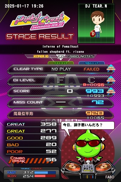 #IIDX #Pinky_Crush 01/17イチオシInferno of Fomalhaut(SPH☆10)。トリルが多くスコア難です。 とはいえクリア自体は簡単なような気がします。もう少しというところでした。