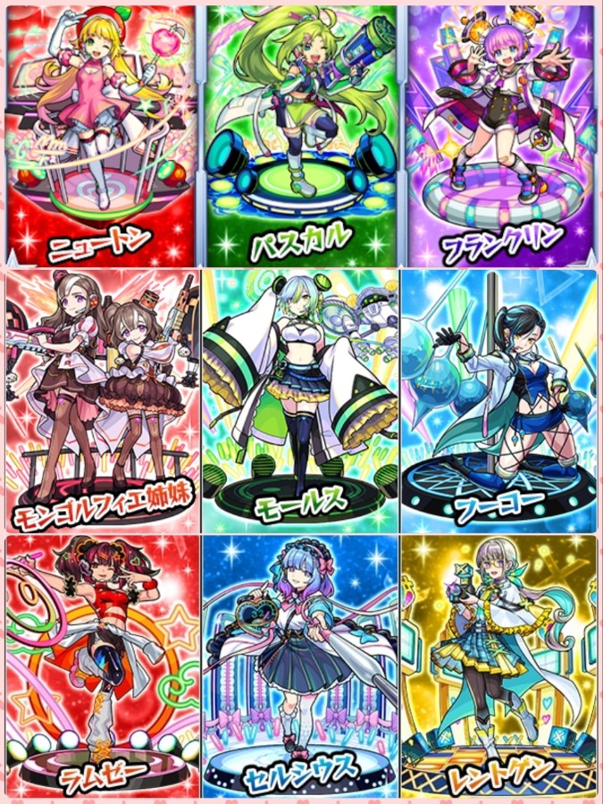 今回の検定の役に立ったかもしれないモンストのアイドル達がこちらです。 …他もアレだけど、モンゴルフィエ「姉妹」はダメじゃないかと思う。
