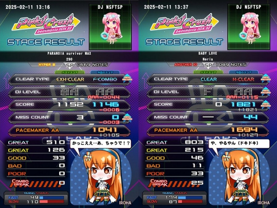 これ以外のAC・SPサイド更新集。 ・PARANOIA survivor MAX (SPH・Lv8):新規フルコン ・BABY LOVE (SPA・Lv10):普→難 (INF達成済み) パラサバは開幕が上手く噛み合わなかったのでフルコンの方が先行しました (^^; 後者は後半の事故率が高めでAC再現に時間がかかった譜面ですな。