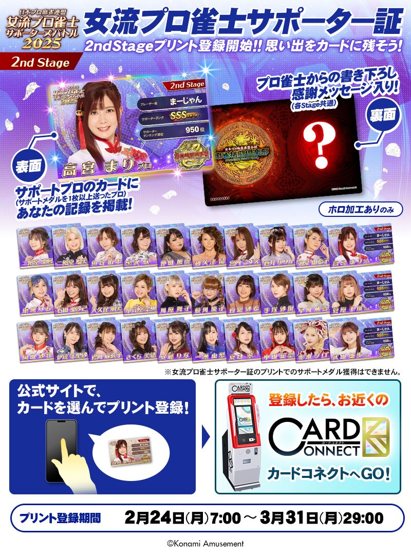 本日よりカードコネクト「女流プロ雀士サポーター証」2nd Stageの登録&発行が可能です。思い出をカードで残そう!! ■プリント登録はこちら http://eagate.573.jp/game/mfc/ac/event/supporters/2025/cardconnect.html#connect2 #麻雀格闘倶楽部 #MFC573