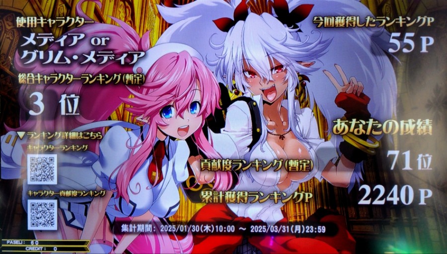 メイン(だいにい@メディア)⋯本日の最終プレー(本日5クレ目,本日の流行語検定4回目)時点のメディア&グリム・メディアのQMAキャラクター大賞のランキング。
