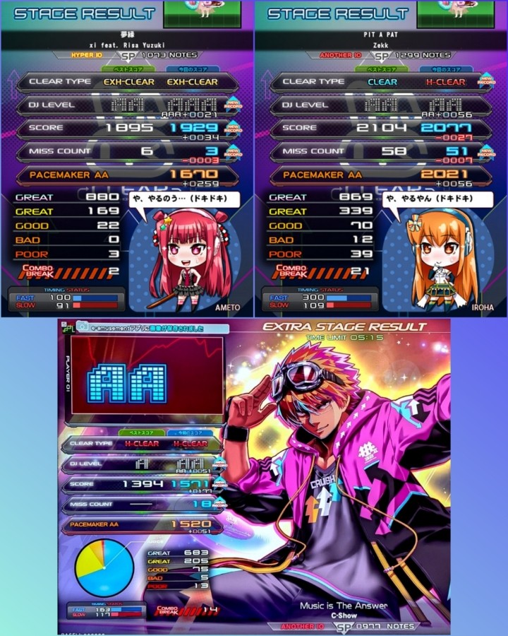 イベント関連以外のSPサイド収穫集その2。 ・夢縁 (SPH・Lv10):再AAA ・PIT A PAT (SPA・Lv10):普→難 ・Music is The Answer (SPA・Lv10):再網羅 (カジュアル大会より) PIT A PATのみ新規クリア収穫。 WEEKLY時初見のみで終わったので更なる更新を狙いました (^^)