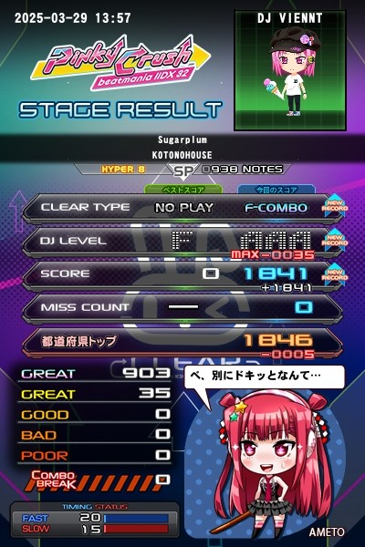 土曜日分 この日は運動前につき、目押しメイン トレーニング?にSP五段 一曲目、『えっワタシ?』灰、初見 35落ちパフェ。本気で挑むも惜しくも道一届かず