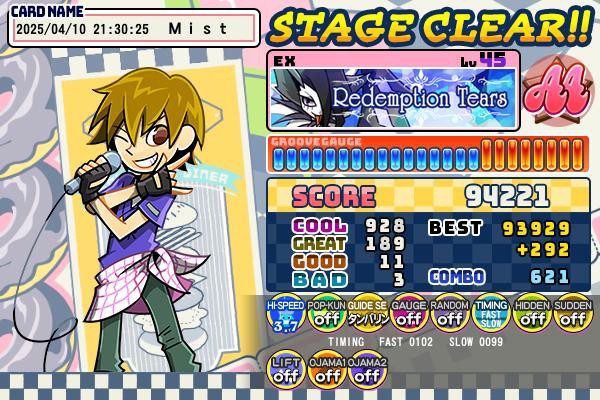 銅◇→銅☆ 打鍵タイミング見失っても無理矢理食らいついてた感覚はあって、BAD減ってる分に相応の伸びしろを作れずに闇雲に食らいついた風なスコア変動幅だよなと。