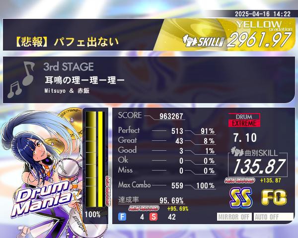 ドラムで中々フルコン出来ない者としては良いリザルトが出ました。
