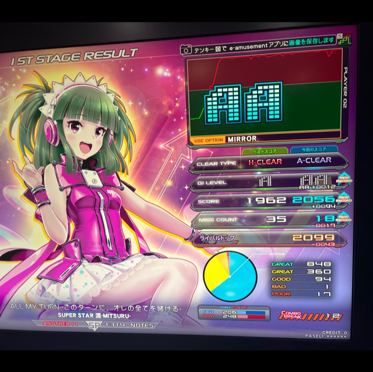 俺ターン鏡かけたらめっちゃ伸びた エクハも狙えそうかな? 最近無駄クレ使わなくなったからなのか、地力の 向上を感じます。 ☆12もハードに拘らず、新規ランプもしっかり つけていきたいですね。