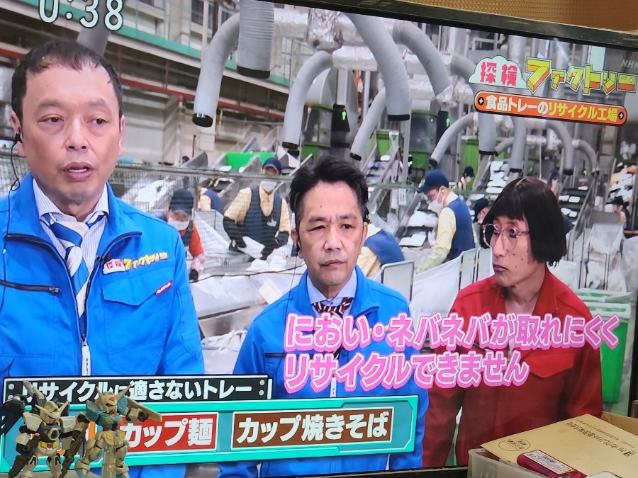 カップ麺・カップ焼きそば・納豆のトレーはリサイクルに向かないって 初めて聞いた(汗) ※隅っこ、ガシャポンで見えにくいです すみません💦 (画像→NHK「探検ファクトリー」)