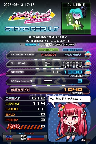 2025.6.13(金)今日のIIDX No.8 地獄超特急 [SPN] 超久しぶりにプレー。 エクハでやっていきなり鳥コン!! 「これは驚いた!2枚やってくれ!」