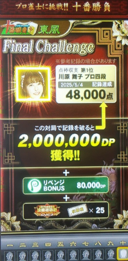 十番勝負東風ファイナル、川原舞子プロ設定は48000点 他のプロ設定もアップ予定!突破は高打点炎卓おすすめ♪