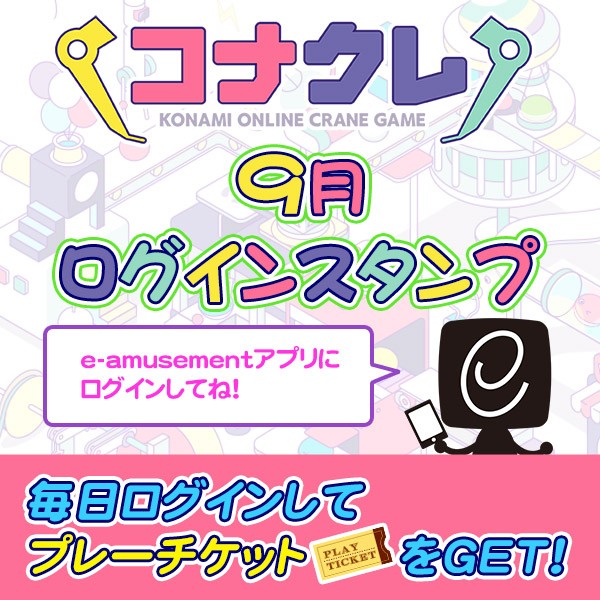 9/1(月)から、「コナクレ 9月ログインスタンプ」が始まるよ! 期間中、e-amusementアプリにログインしてスタンプを獲得したあと、24時間以内にコナクレ公式サイトの景品一覧ページにアクセスすると、コナクレのプレーチケットがもらえるよ(´∀`艸)♡ 景品をGETできたら、アプリの投稿で教えてくれるとうれしいな。 コナクレ公式サイト 景品一覧ページ http://eagate.573.jp/game/getprize/knst/np/select.html <注意事項> ・ログインスタンプは1日1回、期間内に最大30回獲得できます。1日の区切りは毎日5:00です。 ・プレーチケットは、ログインスタンプが押された後に、コナクレの公式サイトの景品一覧ページにアクセスすることで獲得できます。 ・プレーチケットの獲得期限は、各日毎にログインスタンプを獲得してから24時間です。またコナクレ営業時間中に限ります。 ・獲得したプレーチケットには使用期限があります。詳細はコナクレ公式サイトの「発送先・履歴」ページをご確認ください。