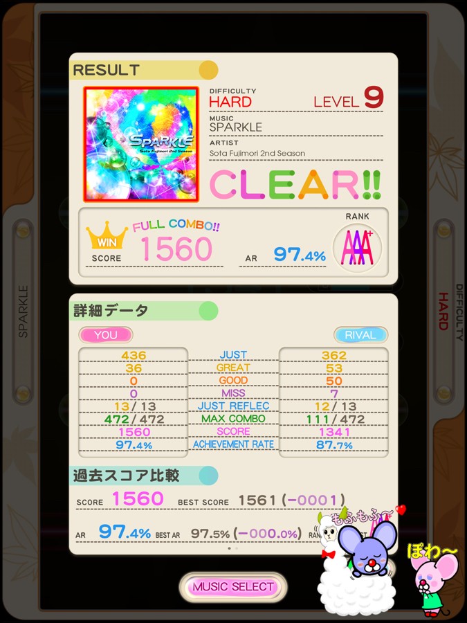 「SPARKLE」赤9を久しぶりにやってみました♪ リフレクだとColette-Summer-、12年前に登場した曲ですね♪ 昨日稼働開始した弐寺のタイトルはSparkle Showerですし、果たしてこの曲の出番はやってくるのか?