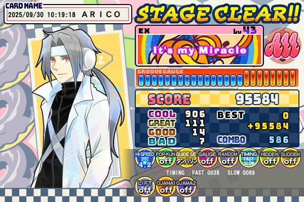 It's my Miracle(EX)初プレー、これ…最初にビックリして、H譜面と同じようにサビでロング2個来るけどEXだと押しながらもう片方で別の配置押し、同時押しの配置が凄かった、AAAランク取れた。