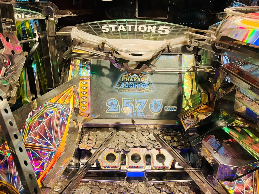 2025年10月9日 JACKPOT第156号!! PHARAOH JACKPOT 2570 WIN 幻のレベル2 傾きが偏ったPHARAOH JPCで左FREEがあったおかげで、2球目でJPパネル当たり、3球目で、くっつくかと思ったらゲート手前でボールがわちゃわちゃしてて粘った末ギリギ JPパネルにもう一回当たり、ダブルファラオJACKPOT獲得 しかしセンター払い出しのゴンドラが動かず何度も再起動しても動かなかったため、急遽ステーション払い出しになってしまいました。楽しみが半減してしまったので、残念でした。 センター払い出しがやっぱりフォーチュントリニティの醍醐味なので、これ以上やっても面白くないのでこのJPで終わりました。