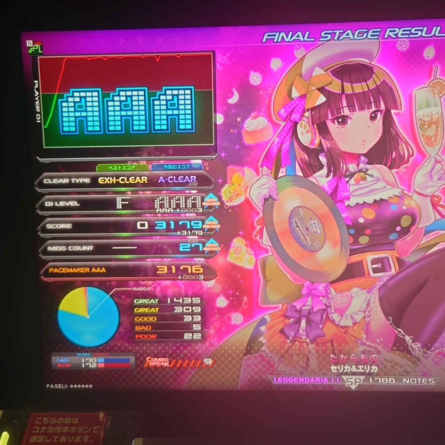 たからものSPLで自身初の鳥! 前作のCHORD稼ぎに使った他の譜面が軒並みボロボロだったからこれはありがたい収穫。とりあえずCHORD値150に届きますように…