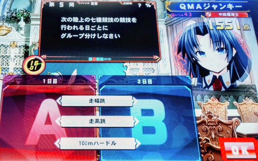 七種競技の実施日、BAAが正解でした 1日目100H、走高跳、砲丸投、200 2日目走幅跳、やり投、800 の順番にやります。 ちなみに十種競技は 1日目100、走幅跳、砲丸投、走高跳、400 2日目110H、円盤投、棒高跳、やり投、1500 の順番にやります