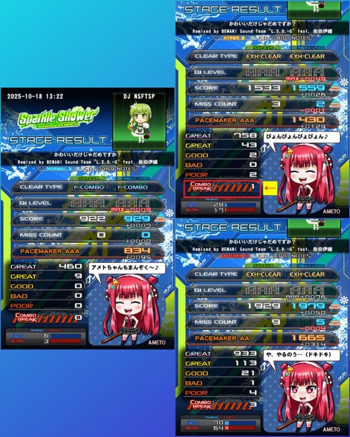 第2週WEEKLYよりかわいいだけじゃだめですか? SPサイド編。 (SPN・Lv5:新規FC&MAX-9) (SPH・Lv8:EXH&MAX-49&CB1 (←)) (SPA・Lv10-:EXH&新規AAA) ※SPN・SPHはシルバー、SPAはブロンズスター獲得。 DPサイドの時にも語りましたが体感難度に少し差があってH譜面はDP、A譜面はSPの方が易しめ。 ・・・ところで、フルコンしなきゃダメですか (^^;