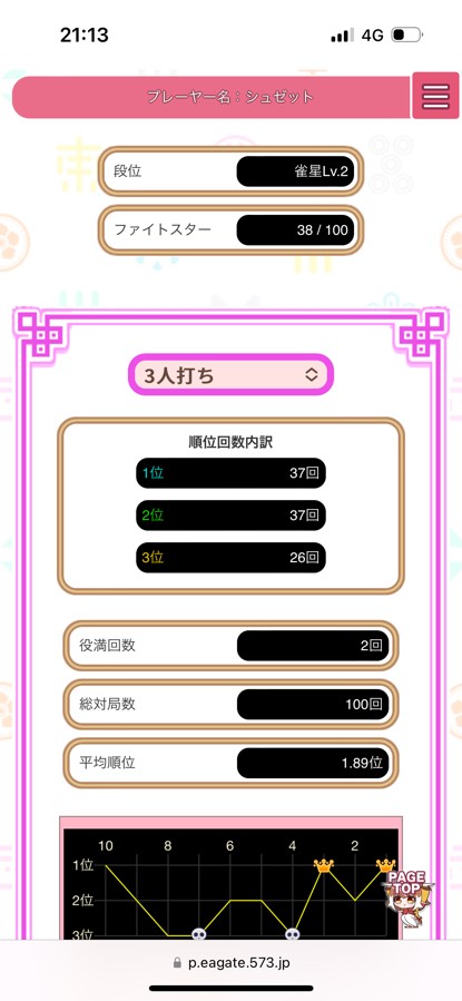 そして8戦したところで、ついに3麻100戦目の節目を迎えることができました🥳 98戦目はセンちゃんで、100戦目はココアで。 勝てた…。よかった…😭 100戦やって37勝かぁ🤔まぁこんなもんですかね? 2位の回数が増えてきてるのが気になってます…。勝ちきれない病😷厄介。 この調子で頑張ります!💪 このあと2連続で2位になりました🥲見える、見えるぞ…!200戦目のころには2位の回数がズバ抜けてる、そんな未来が…!(願わくば3位と1位が逆転する未来だけは避けたい🙏) そして忘れずに雀ポンも回して帰宅。 ほぼほぼ持っていないグッズがやけにダブるのどーしてぇー…😢 今日だけでグリアロのクリスマス鳴きカット3回はみたぞ。あはっそういうイジワルするんだー 痛牌もちょっと見飽きてきたので、季節牌のどれかが欲しかったなぁ😮💨と。 また次回の雀ポンまで我慢ですね😅 対局ありがとうございました🙇♂️