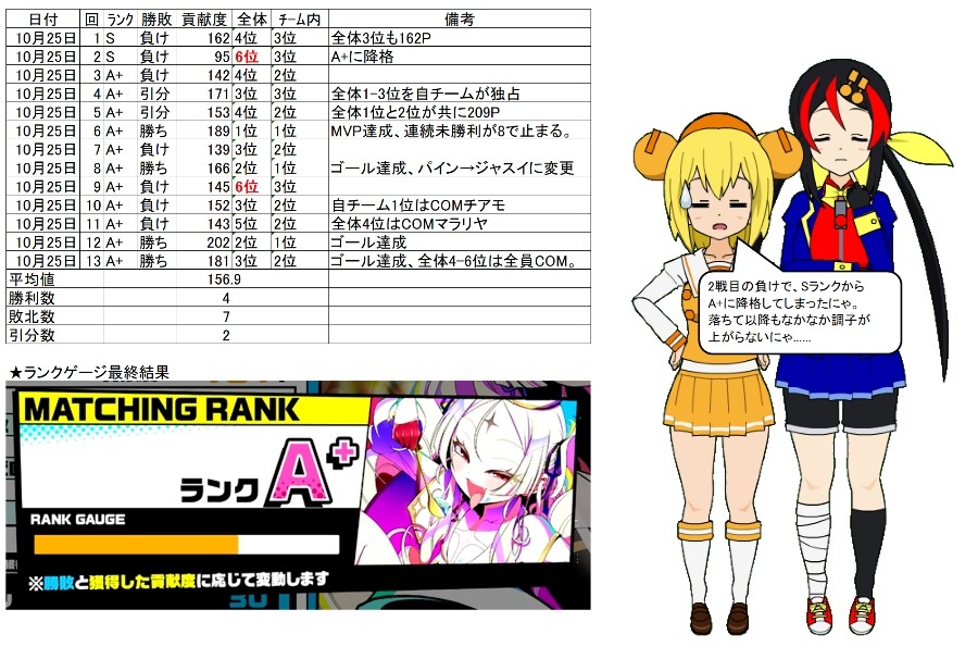 2025/10/25 13試合に対して4勝7敗2分でした。 ハスラーさん、うみとさん、3Nagi3さん、カナメさん、にしじみさん、おおいなるみやいさん、umtiさん、こでけんさん、はくれあさん、はっさくさん、ヘタピッピさん、しせにひちひさん、ギャロップさん、ヤツフサさん、匿名希望さん、マッチングありがとうございました… (抜けがあったらごめんなさい。) テコ入れのため、途中からパインではなくジャスイを起用しました。 さて、どうなるだろうか。