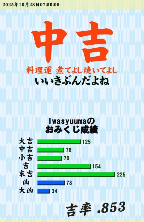 今日のおみくじ! 「いいきぶんだよね」? いや、別に。オレは昨日嫌な気分(腹痛)を感じただけだよ。 吉率0.85301(+0.00019)(650/762) (最近の凶から6日連続で凶引かず) https://p.eagate.573.jp/gate/e/toomikuji.html?from=article