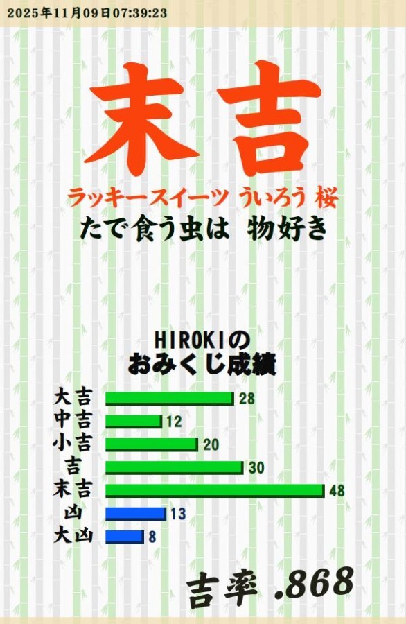 今日のおみくじ! 未吉 吉率 .868 https://p.eagate.573.jp/gate/e/toomikuji.html?from=article