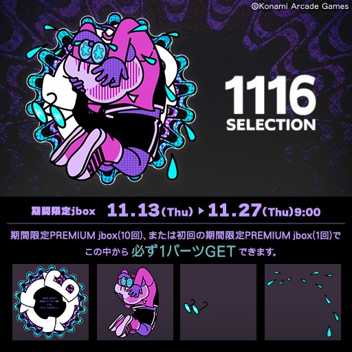 【全てを超越した日】 本日より期間限定jbox「1116・セレクション」が登場! 初回のみ「期間限定 PREMIUM jbox(1回)」でSPエンブレムのパーツから1つ確定で出現しますよ! http://eagate.573.jp/game/jubeat/beyond/jbox/