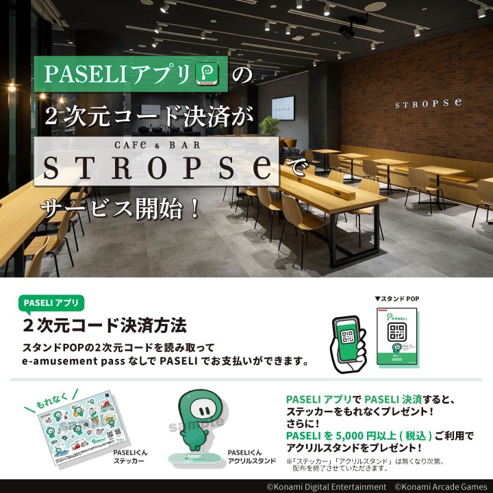 本日より、CAFe&BAR STROPSeでPASELIアプリ2次元コード決済サービスを開始します。 PASELIお支払いでPASELIくんステッカーをプレゼント! さらに5千円以上のお支払いでアクリルスタンドをプレゼント! 特典は無くなり次第終了です。 CAFe&BAR STROPSe公式サイト https://www.konami.com/ginza/stropse/
