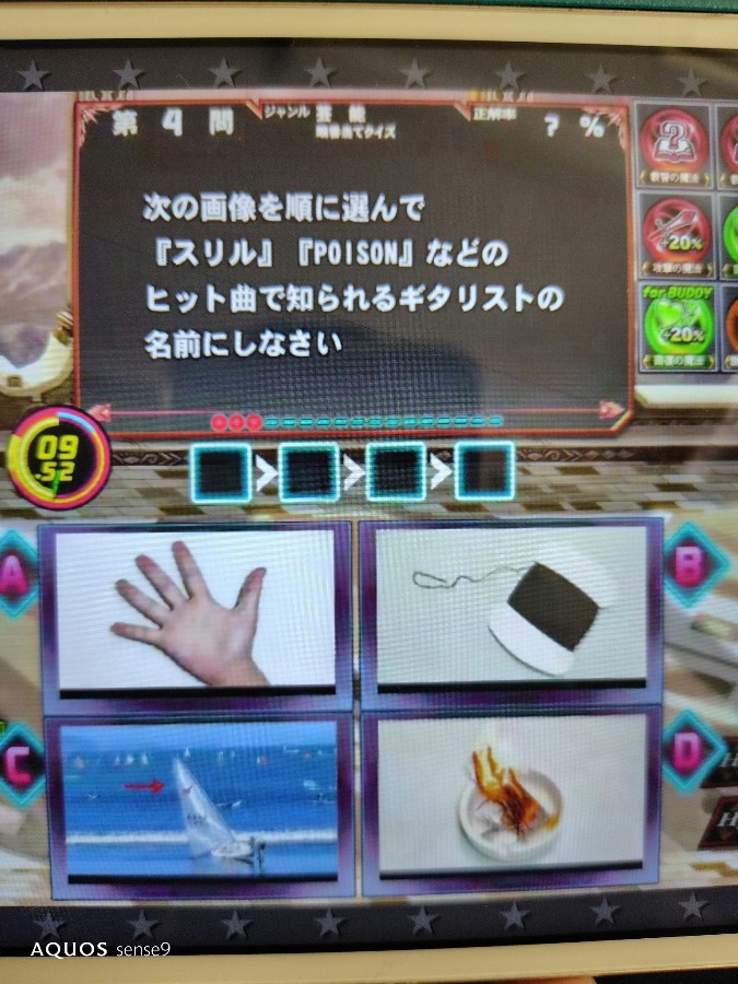 ソロクエの装備が全く揃わないのでまだNORMAL1エリアに居座ってるのですが、その時に出た順当て問。 帆→手→糸→燃やす、これで布袋寅泰だそうです(笑)。 布袋寅泰と言えば、中学の期末試験の虫食い問題で最初の7問(解答用紙では一番上の段)の正解の選択肢がほ→て→い→と→も→や→すになってた事がありました(笑)。